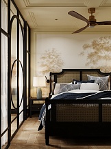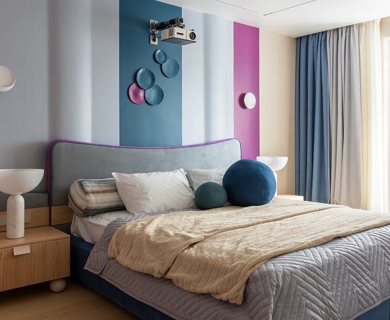 Детали интерьера бережно, но ненавязчиво напоминают о том,что герои любят спорт (через волнообразную, плавную геометрию интерьера – отсыл к волнам или элементы интерьера в виде подушек-шаров, круглых ножек прикроватных тумб или пуфика перед кроватью, напоминающих про футбол)