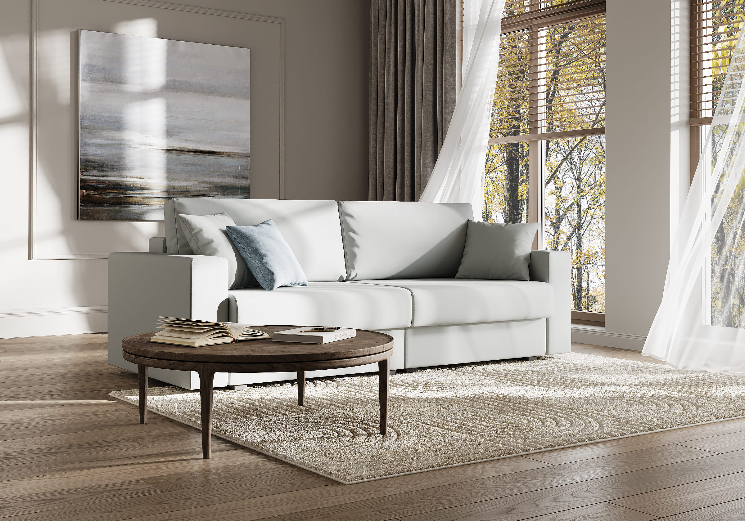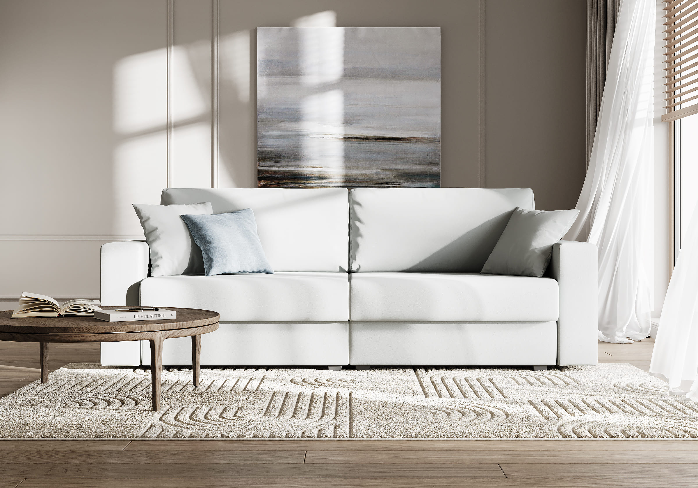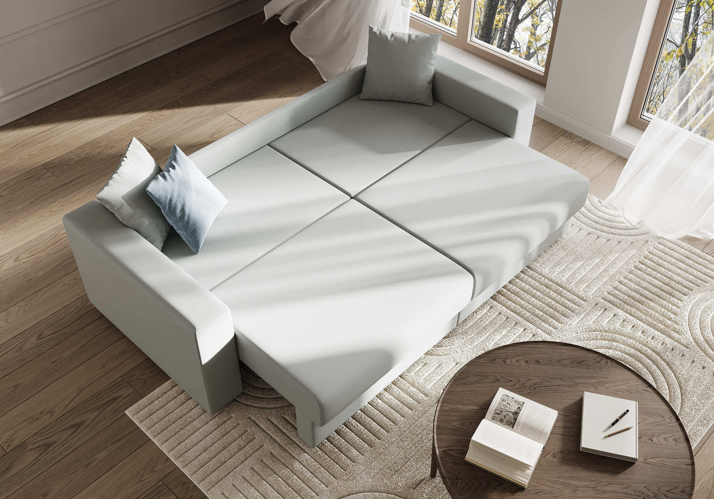 Интерьерный диван Freedom для сна в современном стиле с механизмом трансформации пантограф двойного разложения и коробом для хранения. Модель без декора с прямыми пропорциональными подлокотниками органично впишется в современные интерьеры. Диван идеален для квартир-студий, гостиных и гостевых комнат. Сидение и спинка делятся на две части отдельными механизмами трансформации и матрасами, что делает диван функциональным. При этом анатомический матрас с блоком независимых пружин средней жесткости остается удобным для сна. Глубина и высота сиденья обеспечат ежедневный комфорт. Задняя спинка предотвращает загрязнение и повреждение стены. В основе мягких подушек – микс наполнителей: поролоновая крошка не дает деформироваться, а синтетическое волокно добавляет комфорт. В комплектацию дивана входят две декоративные подушки, которые позволят корректировать глубину посадки и выгодно дополнят внешний вид дивана.
