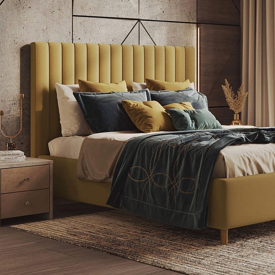 - Кровать с мягким высоким изголовьем для уютной спальни;