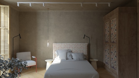- Кровать с массивным деревянным основанием, подчёркивающим природный характер интерьера;