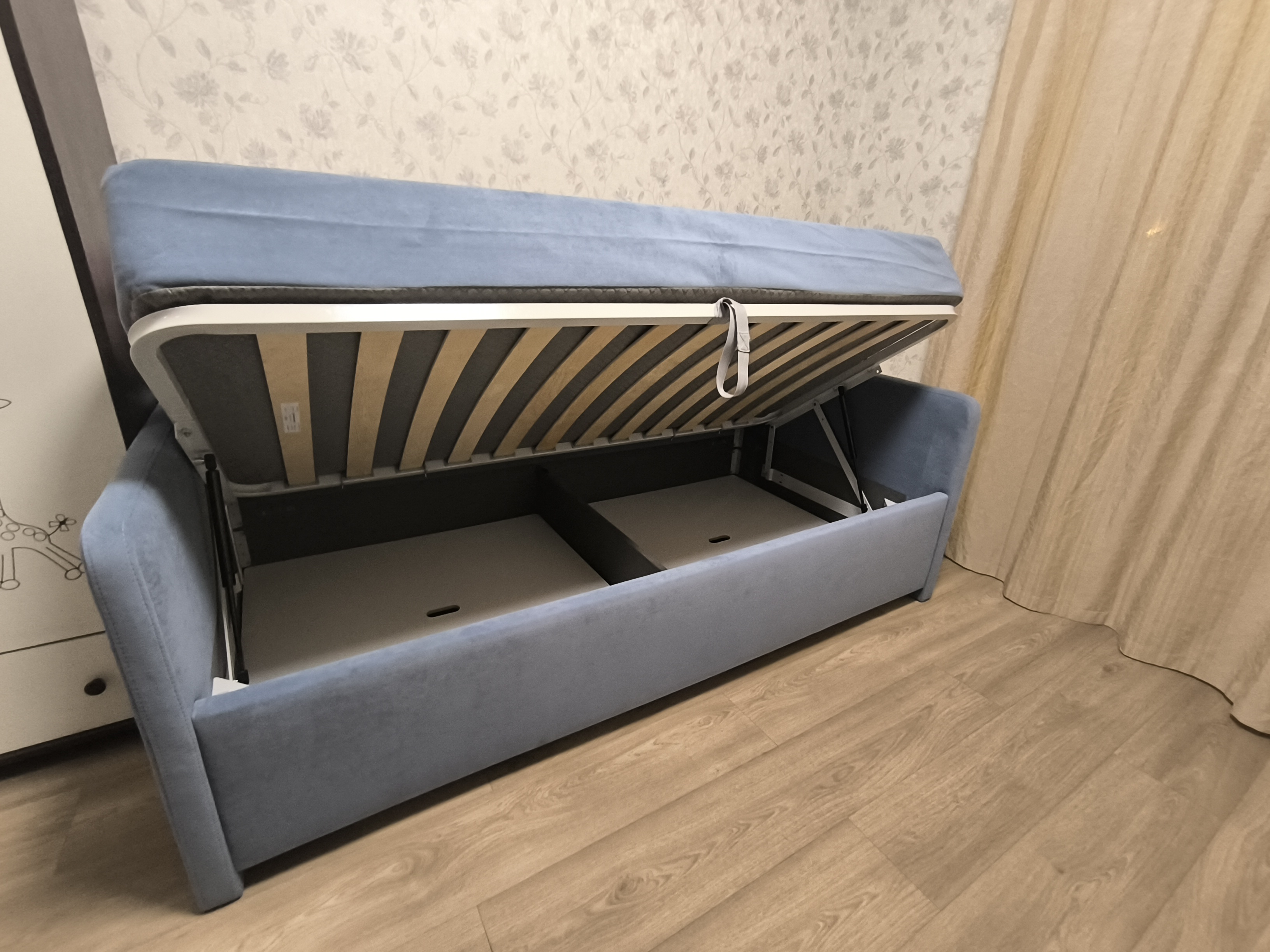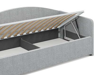 Возможна установка подъемного механизма со вместительным бельевым ящиком. Дно бельевого ящика легко сдвигается для обеспечения уборки под кроватью.