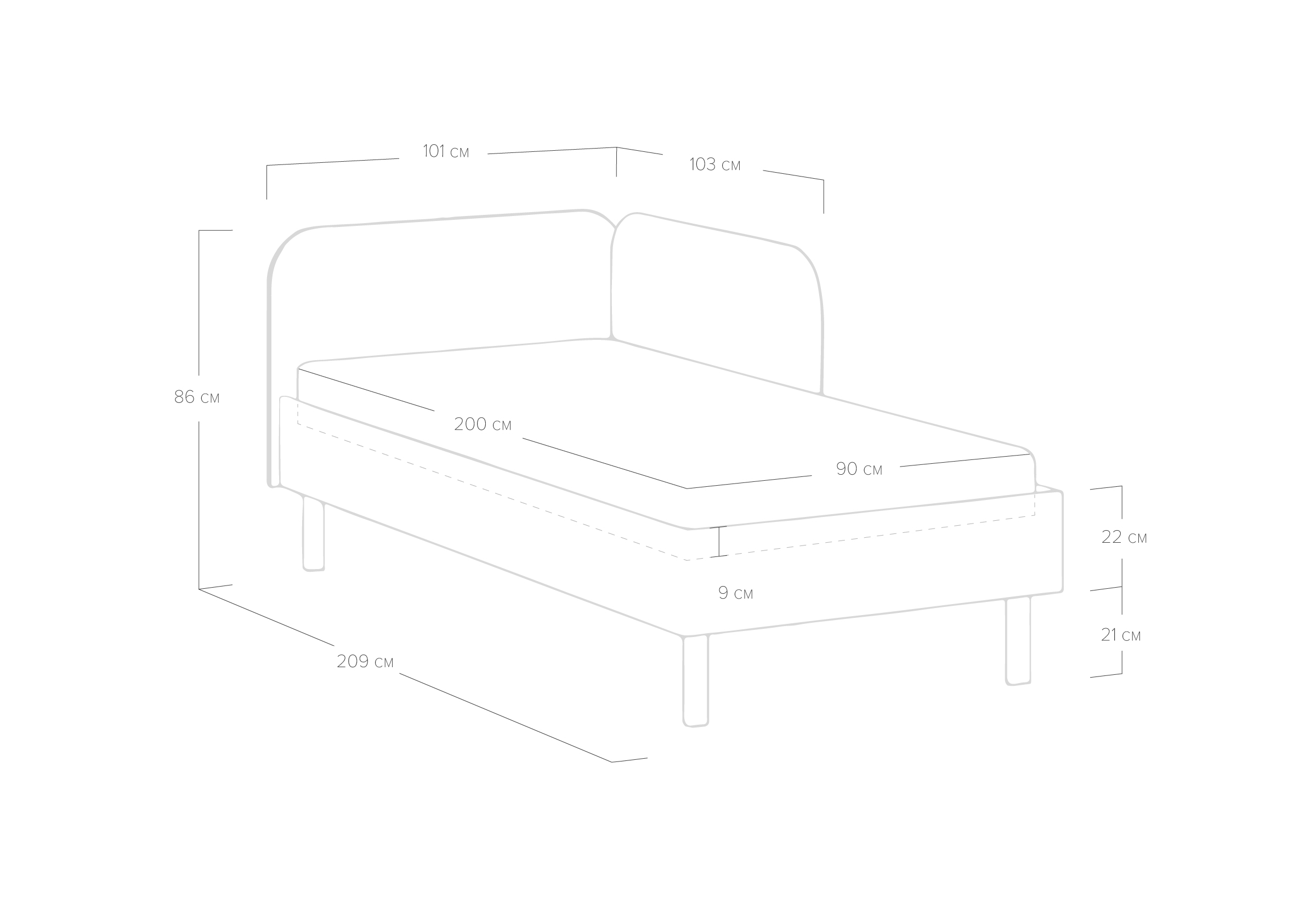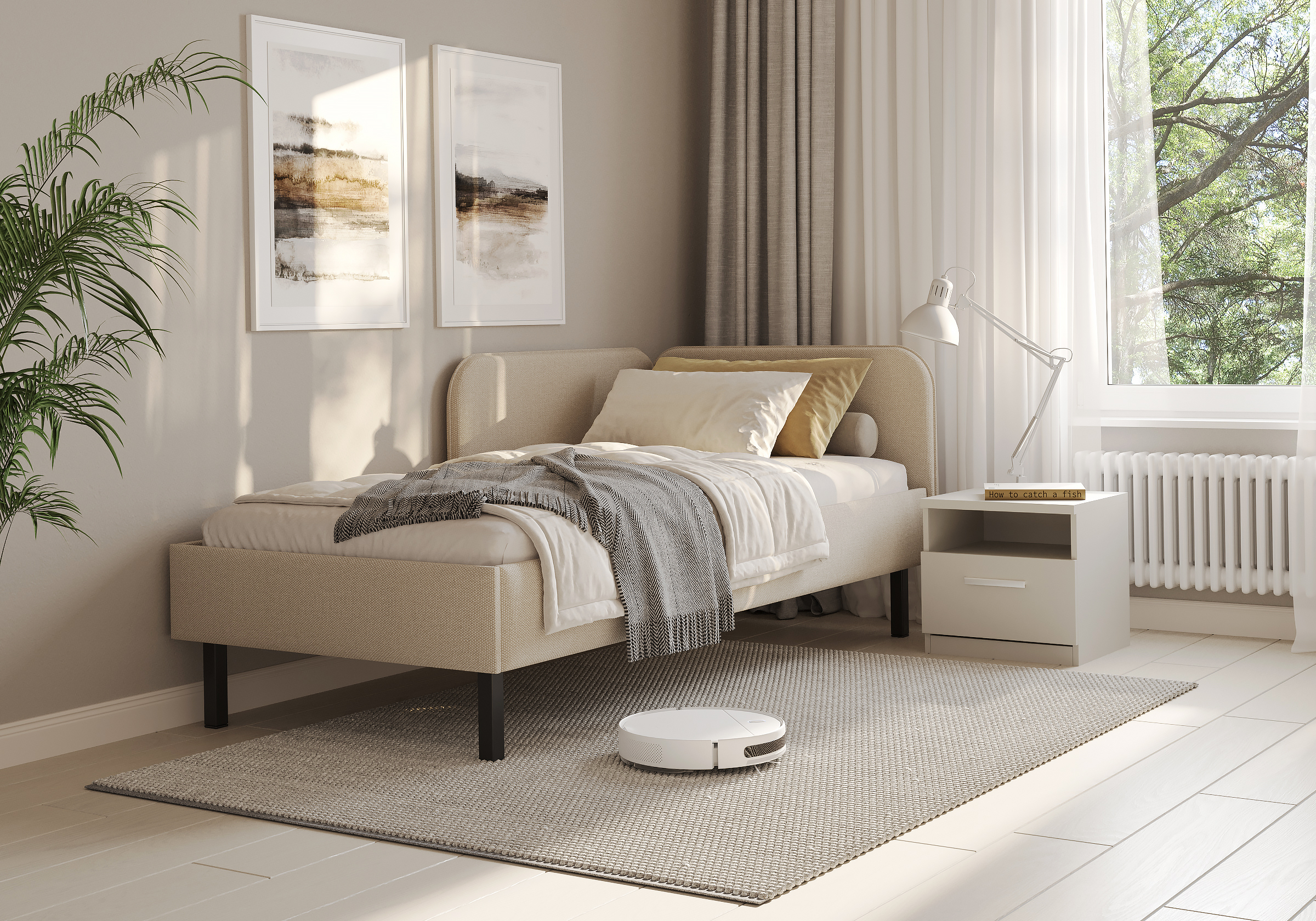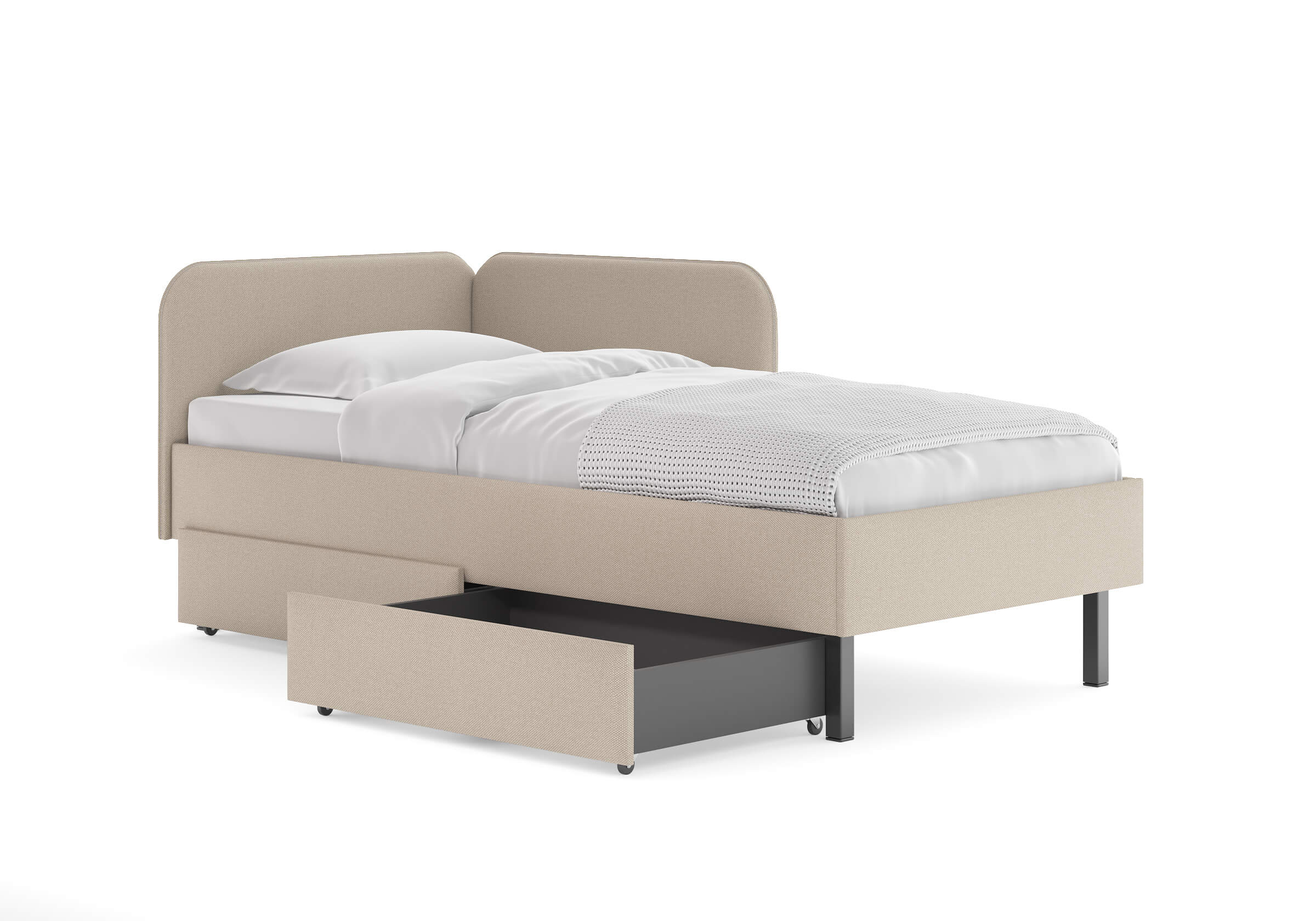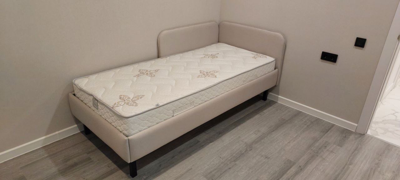 Основание кровати на высоких металлических ножках. Благодаря увеличенной высоте позволяют осуществлять легкую уборку под кроватью, даже с помощью робота-пылесоса.