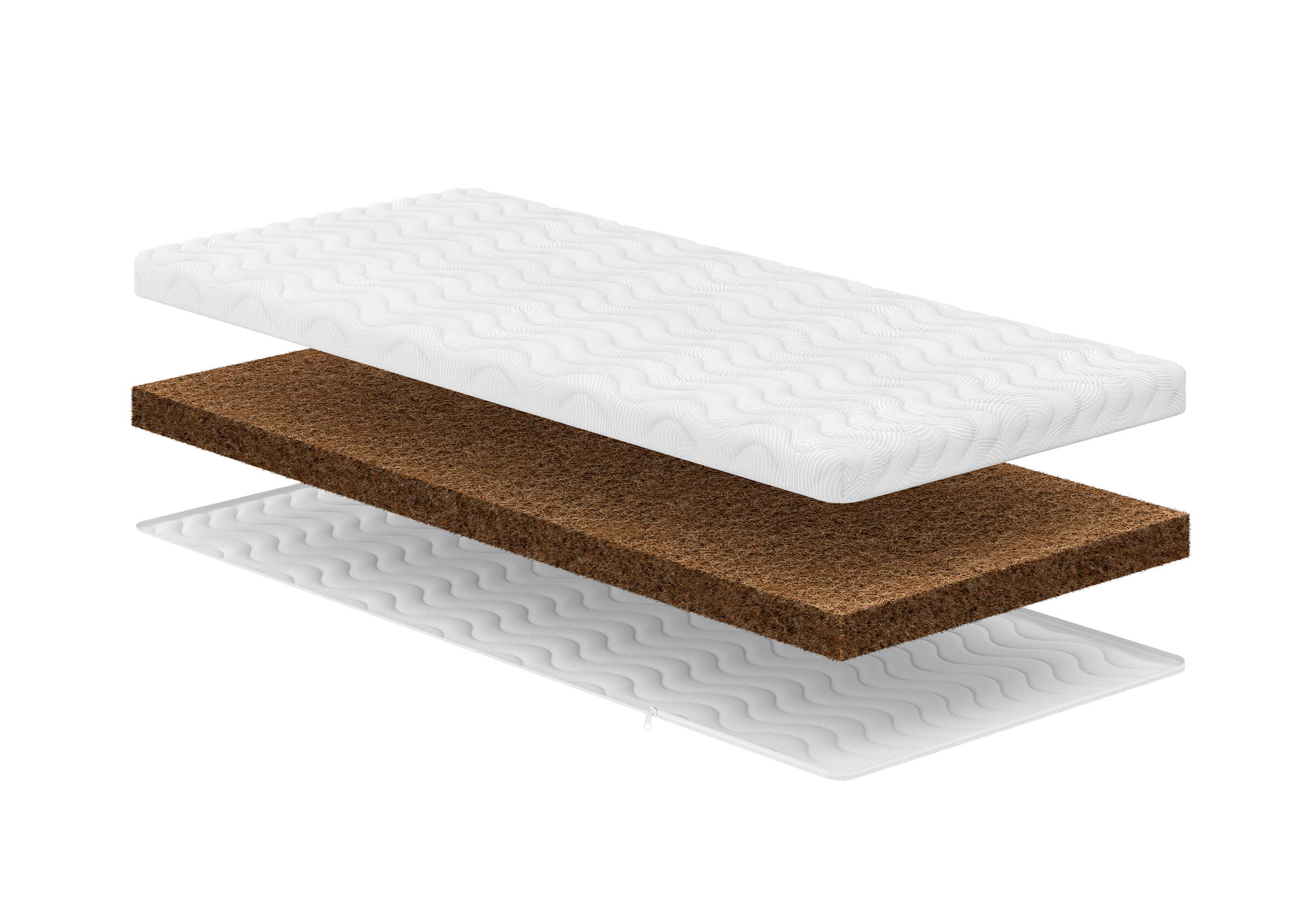 Жёсткий матрас, который подойдёт для малыша с первых дней жизни. Изготовлен из кокосовой койры, пропитанной натуральным латексом. Матрас гипоаллергенен, способствует циркуляции воздуха и теплообмену, обладает антибактериальным эффектом. Чехол матраса изготовлен из хлопка. При необходимости его можно снять и постирать.