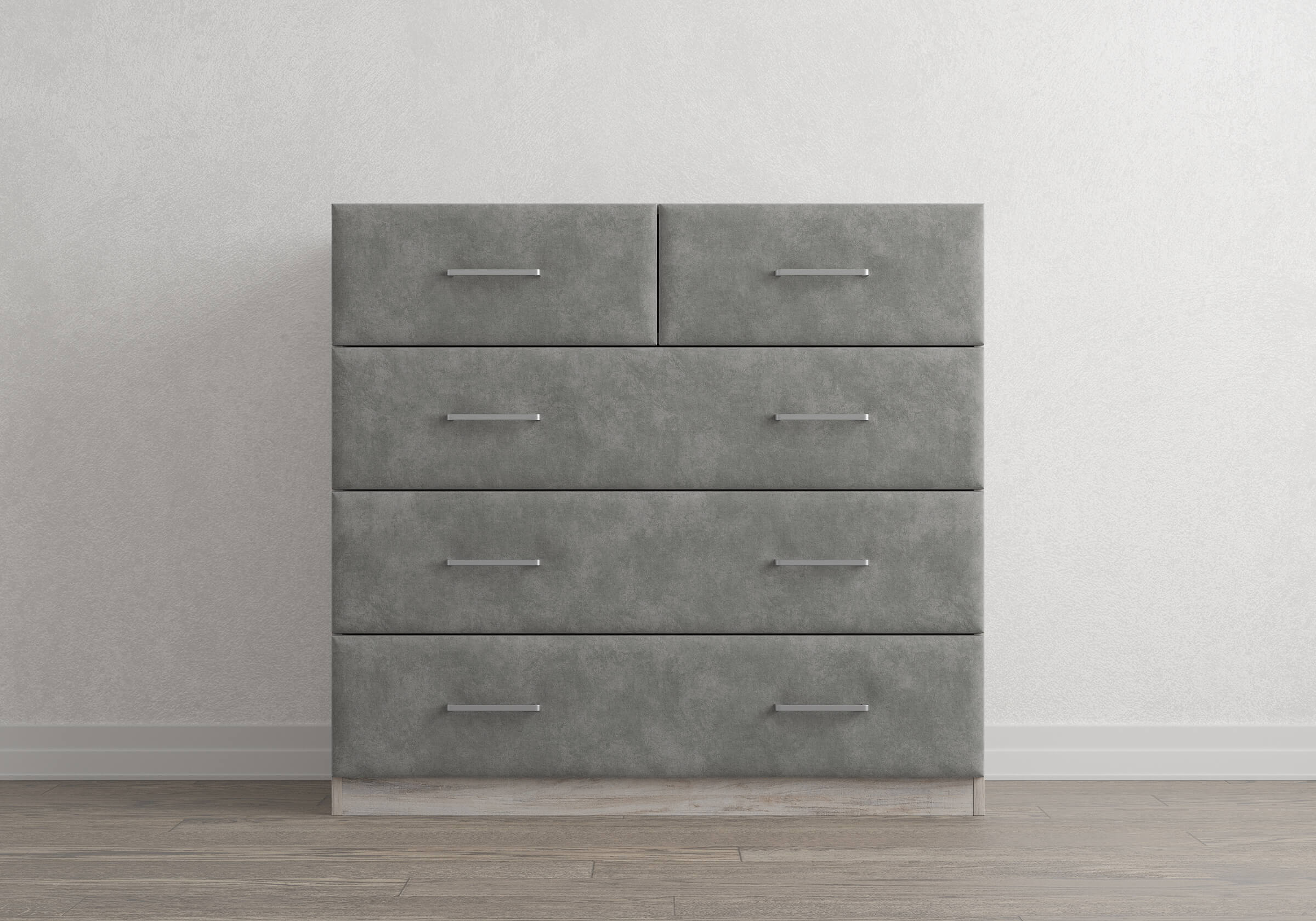 Комбинированный комод Tomas с пятью вместительными ящиками станет элегантным дополнением интерьера. Корпус, выполненный из высококачественной ЛДСП, гарантирует прочность и долговечность, а мягкие фасады в ткани и изящные металлические ручки добавят уют. Комод имеет скос под плинтус, это позволяет устанавливать его вплотную к стене. Благодаря своему дизайну и широкому выбору вариантов исполнения комод можно разместить не только в спальне, но и в прихожей или гостиной.
